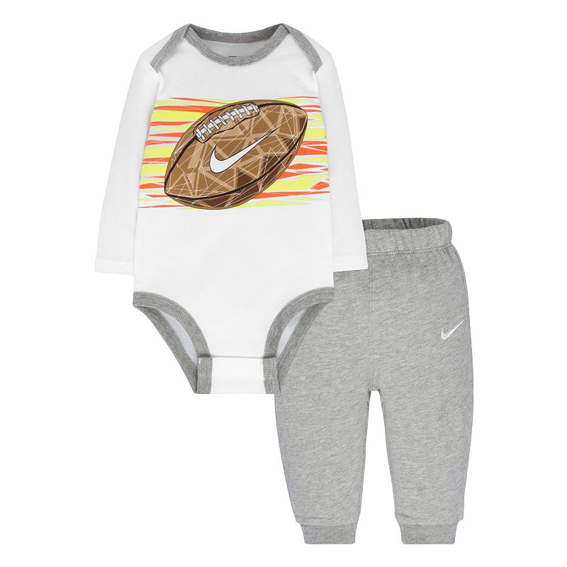pants Bodysuit: envelope neck, long sleeves, inseam snaps Pants: elastic waistband, banded hems Sporty graphic Embroidered Nike Swoosh Fabric &