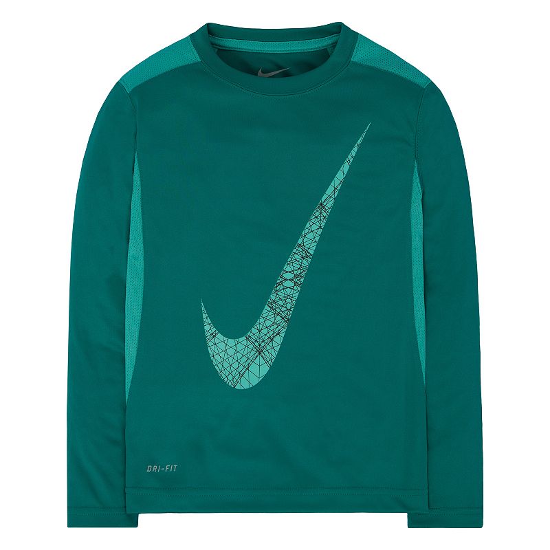 Mesh piecing keeps him cool and comfortable in this boys' Nike Dri-FIT swoosh performance tee