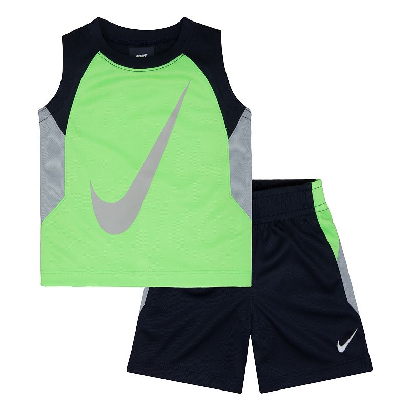 Keep him cool and dry all day long in this boys' tank and short set from Nike, featuring breathable mesh material and the bright, bold look of the iconic Nike Swoosh