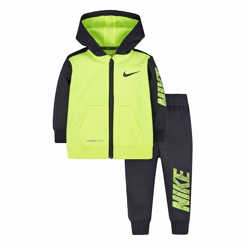 pants Hoodie: zip front, long sleeves, attached hood Pants: elastic waistband, banded hems 2 functional pockets Silicone Nike Swoosh Bold Nike graphics Tag-free design Therma-Fit Fleece construction Mesh hood lining Fabric &